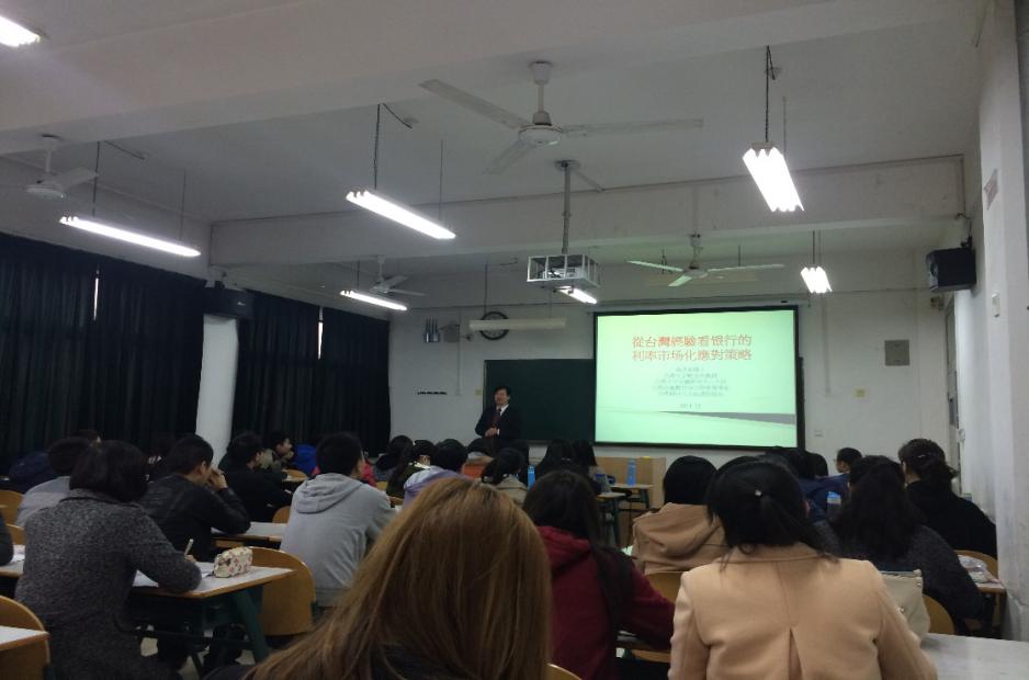 2015年3月17-18日,台湾大学金融学黄达业教授应邀校访问我院。访问期间,黄达业教授为我院金融学等专业本科生、硕士研究生做了题为《从台湾经验看银行的利率市场化应对策略》的讲座,通过分析台湾地区30年来银行业发展的历史及经验教训,重点展示了台湾银行业平均加权存放款利率变动趋势、台湾银行业主要收入变动趋势,对比不同国家与地区利率市场化的进程,介绍了利率市场化下银行的战略。他还与学院高培中心与相关人员进行座谈,重点介绍了“AFMA高级金融管理师”项目。