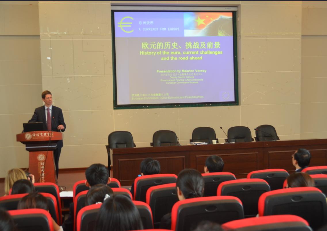4月11日,由欧洲委员会经济与金融事务总司、欧盟驻华代表团和我院联合举办的欧元展学术报告会在金海报告厅举行,报告会的主题是“欧元的历史、挑战及前景”。来自中国人民银行和欧盟驻华代表团的代表出席了活动,来自陕西电视台、西安日报社和西部网等五家媒体对活动进行报道,我院260余名师生聆听了报告。报告会由西北大学党委副书记黄建民主持。
