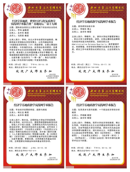 2022年3月16日至3月18日,经济学系克服疫情困难、如期成功举行了以“践行十九届六中全会精神 推动陕西经济高质量发展”为主题的教学实践周活动。围绕经济社会前沿热点问题,邀请来自南开大学经济学院的乔晓楠教授、西南财经大学经济学院的韩文龙教授、西北大学中东研究所的李玮副教授、776net必赢官网的李晓华博士举行了四场主题讲座。讲座内容涵盖了世界经济政治格局变化、政治经济学经典理论问题、数字经济前沿研究和质性研究方法介绍。此次活动由系主任高煜教授指导,吴丰华教授和段雨晨博士具体负责。经济学基地班三个年级共91名学生参与了本次活动。同时,线上讲座还吸引了来自部分国内兄弟高校的老师同学,以及我院部分MBA学生共同参与。
