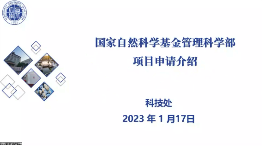 而后,学校科技处项目科胡阳科长介绍了国家自然科学基金管理科学部项目申请情况,包括国家自然科学基金管理科学部的组织架构、十三五以来全国和我校关于管理学科部面上项目、青年基金的立项情况以及自然科学基金委在2023年的改革举措和注意事项等。
