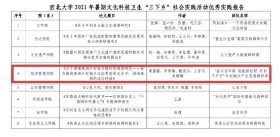 近日,中共陕西省委宣传部、中共陕西省委文明办、中共陕西省委教育工委、共青团陕西省委、陕西省学生联合会印发《关于2021年陕西省大中专学生志愿者暑期文化科技卫生“三下乡”社会实践活动先进集体、先进个人的通报》的文件中,由我院师生组成的西北大学“奋斗百年路 启航新征程 百村千户行”社会实践团荣获2021年陕西省大中专学生志愿者暑期文化科技卫生“三下乡”社会实践活动“省级标兵团队”荣誉称号。