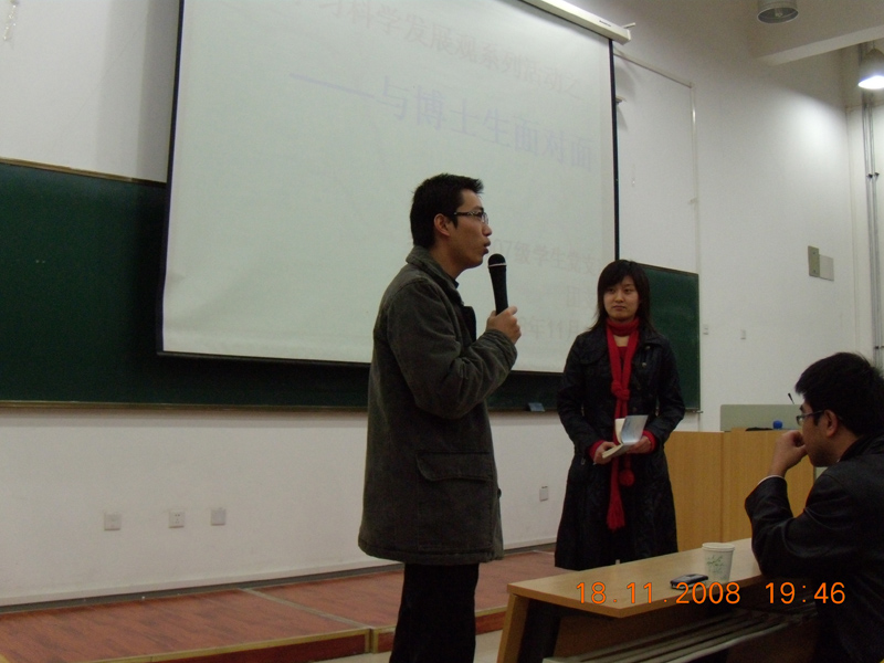 2008年11月18日晚,我院07级学生党支部在2J201教室举办了“与青年博士话学习”学习经验交流会,支部书记张洪杰主持了本次会议,07级党支部100多名学生党员、积极分子参加了交流会,本次交流会是07级党支部在深入落实实践科学发展观、树立优良学风活动中的系列活动之一。